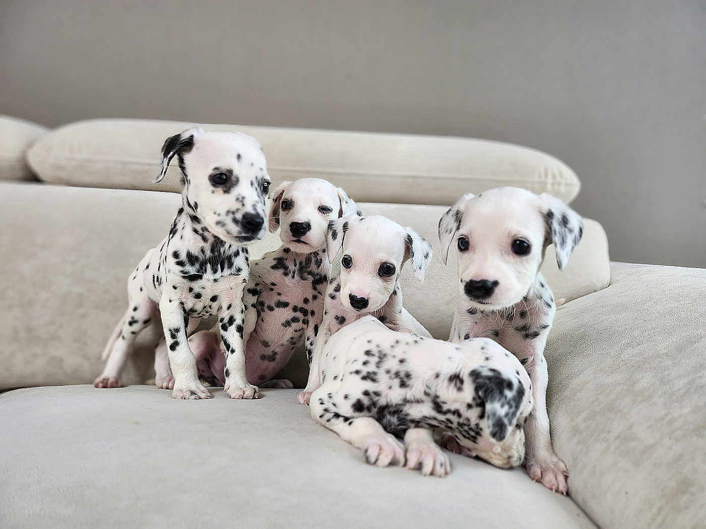달마시안의 가장 큰 특징은 독특한 반점 무늬입니다. 흰 바탕에 검은색 또는 갈색의 점이 고르게 분포되어 있으며, 태어날 때는 반점이 없는 흰색으로 태어나 점점 반점이 나타납니다.