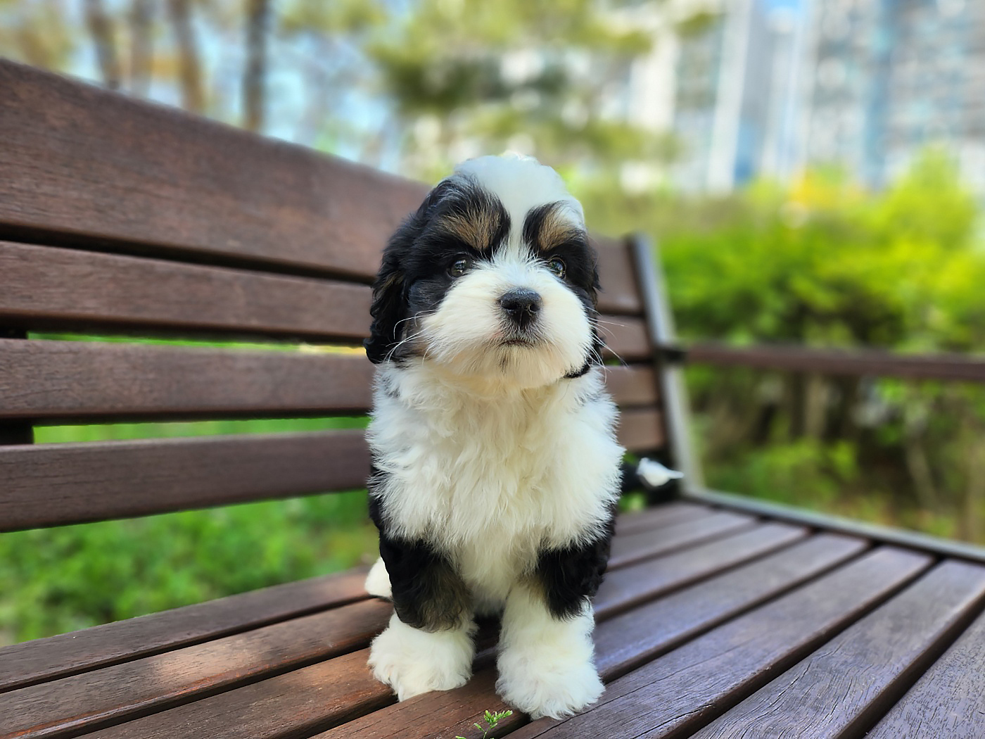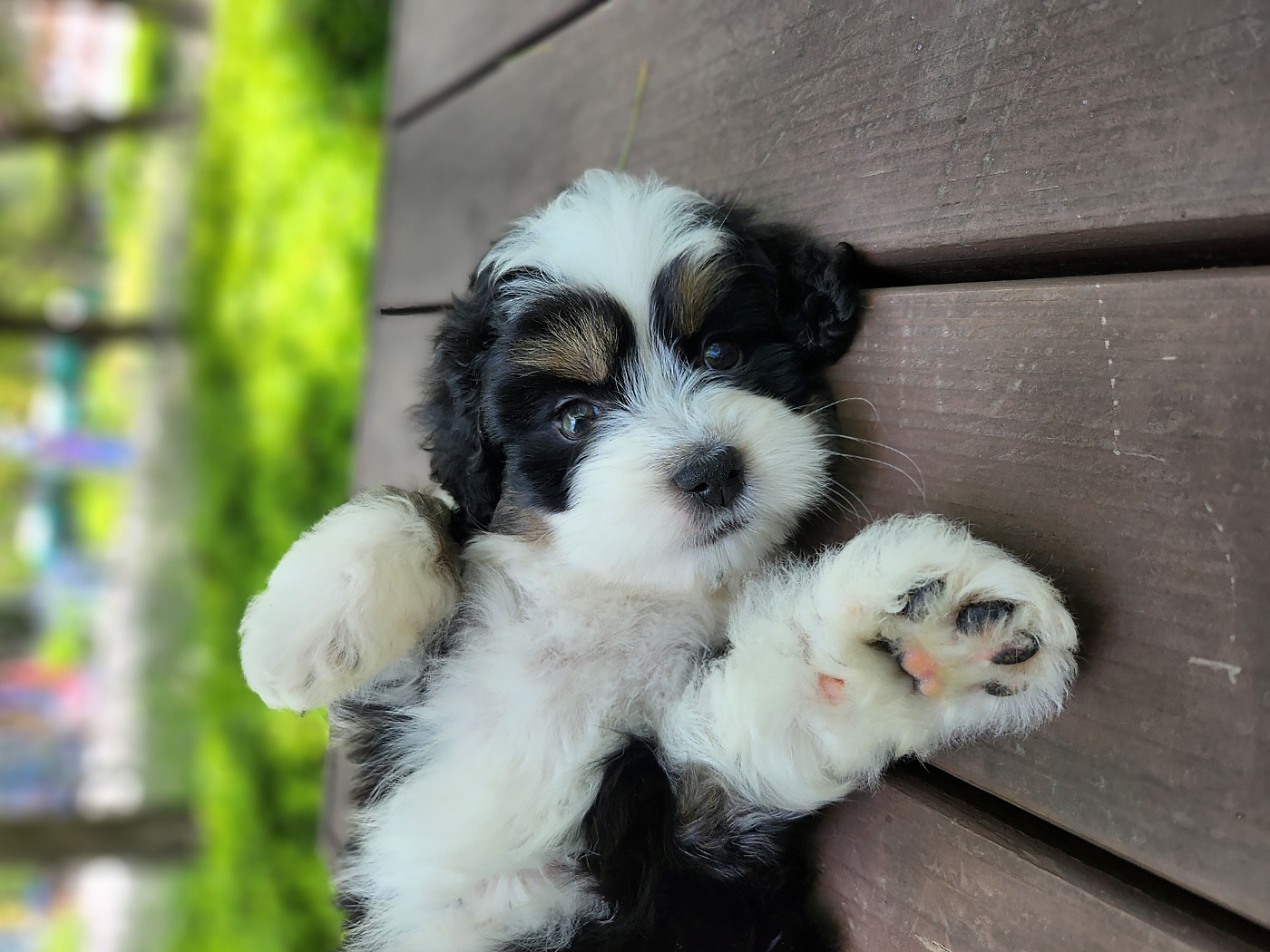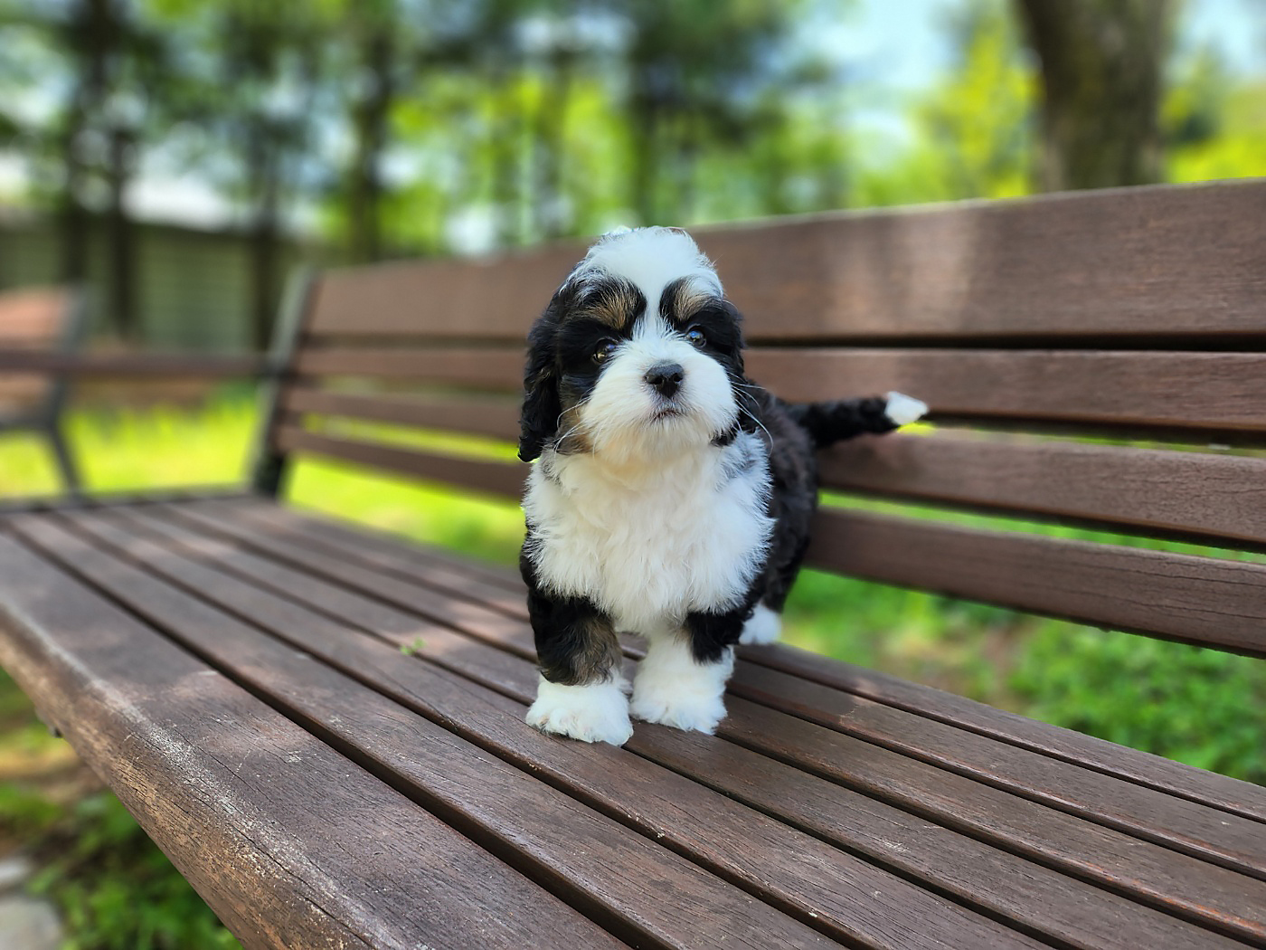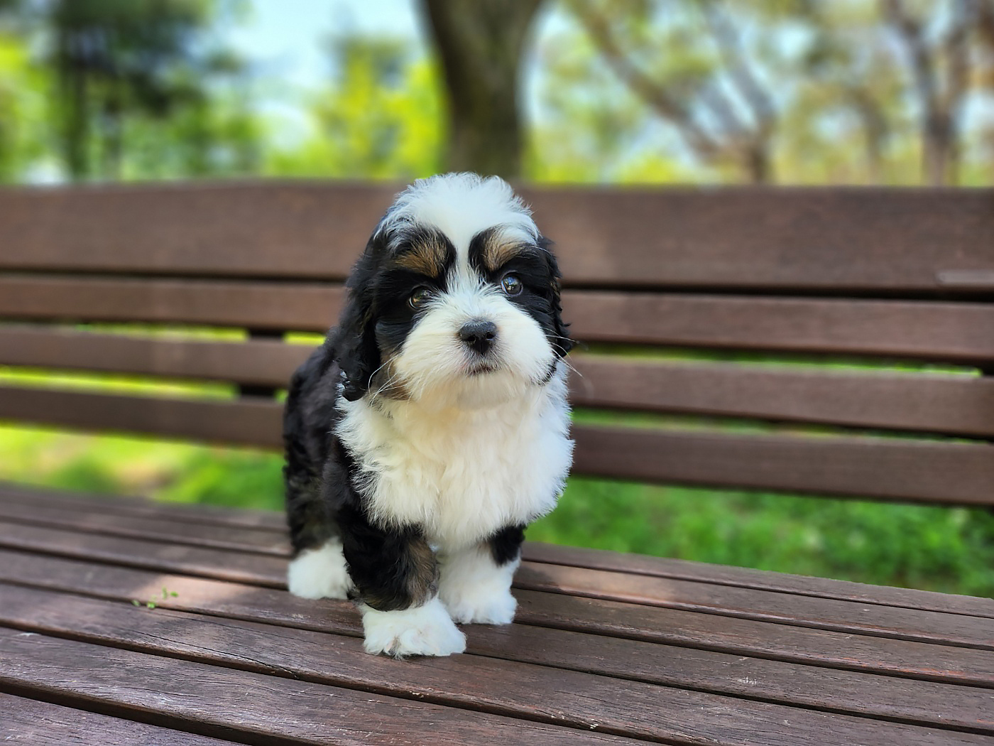 버니두들은 다양한 색상과 패턴의 털을 가지고 있는데, 특히 블랙, 화이트, 브라운이 섞인 트라이컬러는 가장 인기 있는 색상 중 하나입니다. 또한, 푸들의 특성을 물려받아 곱슬거리거나 웨이브진 털을 가지고 있어 관리하기 쉬워요.