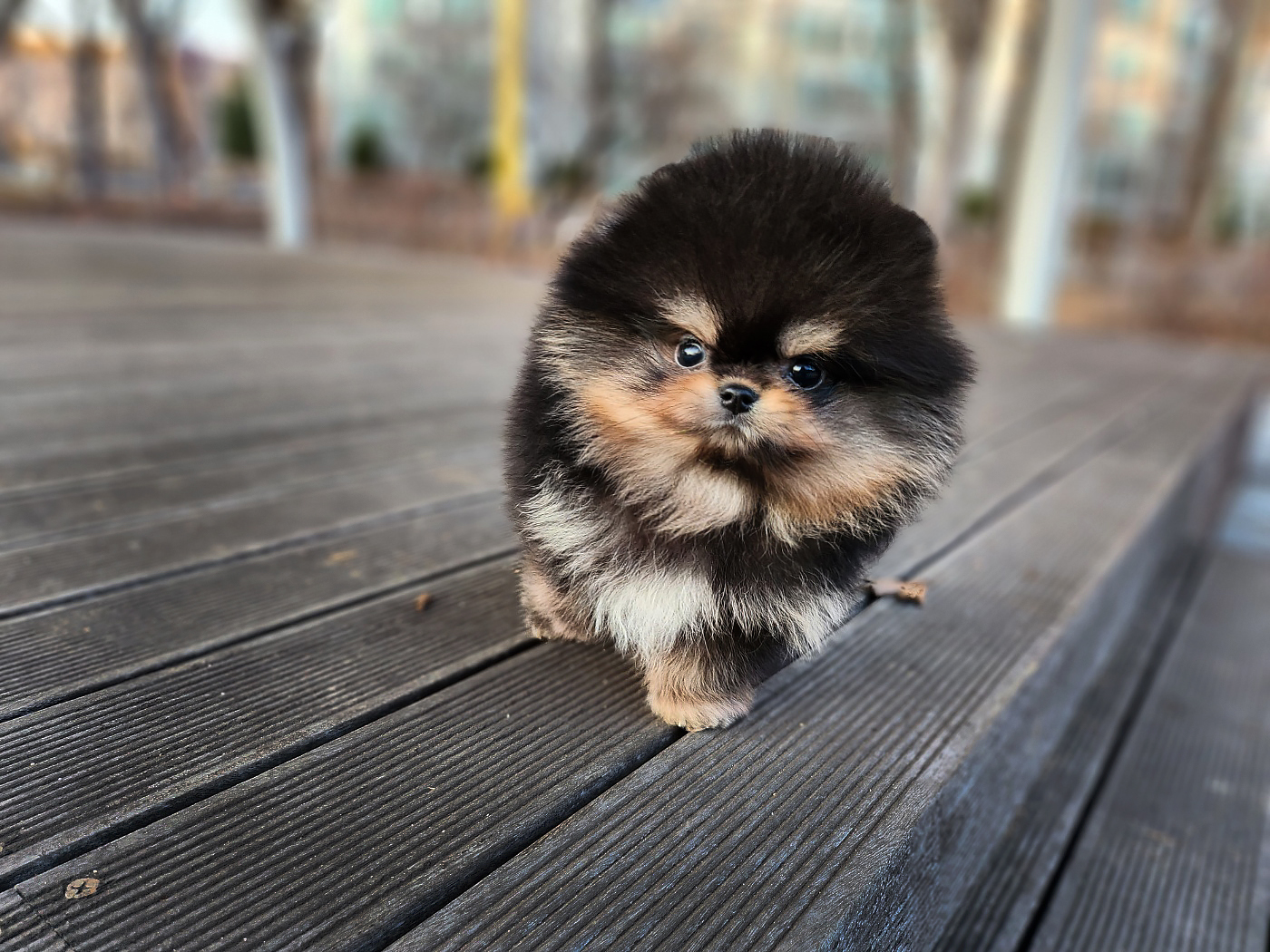 포메라니안의 특징인 작고 앙증맞은 체구를 그대로 가지고 있으며, 풍성하고 부드러운 이중모가 매력을 더합니다. 블랙탄 색상은 이 풍성한 털과 만나 고급스러운 느낌을 줍니다.
