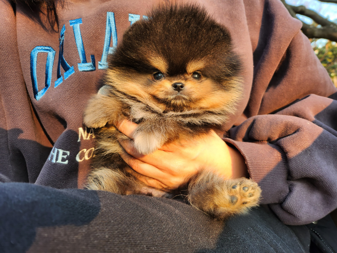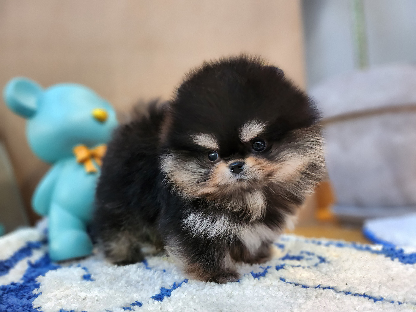 포메라니안의 특징인 작고 앙증맞은 체구를 그대로 가지고 있으며, 풍성하고 부드러운 이중모가 매력을 더합니다. 블랙탄 색상은 이 풍성한 털과 만나 고급스러운 느낌을 줍니다.