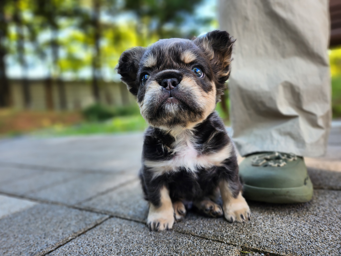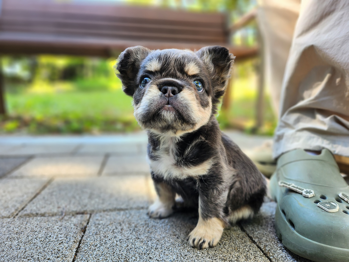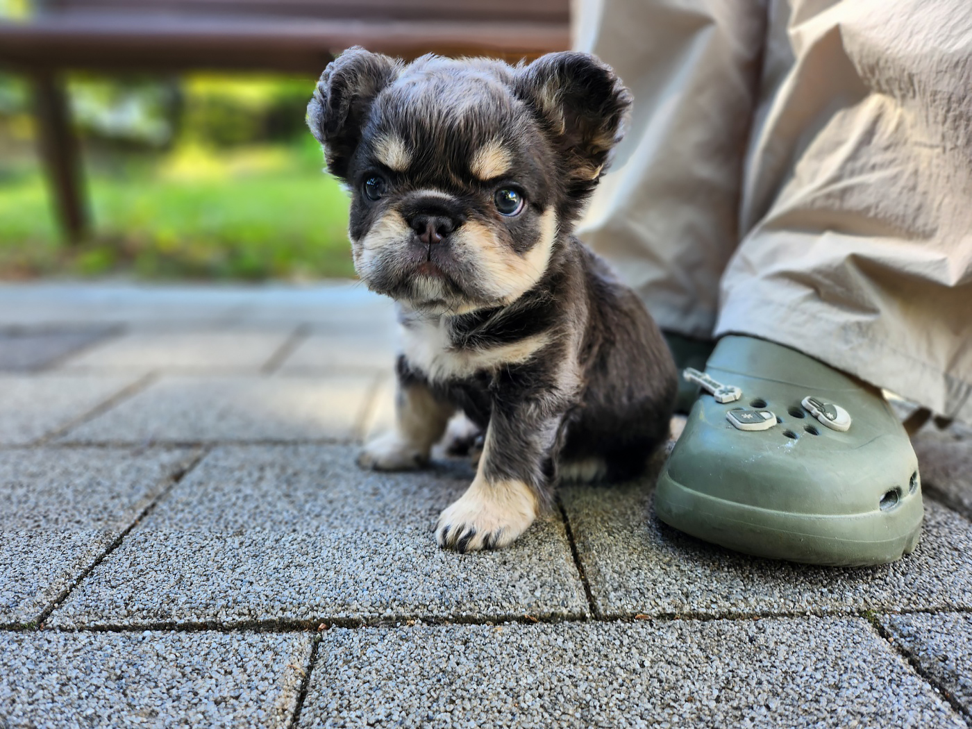 장모 프렌치 불독은 긴 털 덕분에 더욱 풍성하고 부드러운 외모를 가지고 있습니다. 특히 귀와 목, 가슴 부분의 긴 털이 독특한 느낌을 줍니다. 일반적인 프렌치 불독이 짧은 털을 가진 것과 달리, 장모 프렌치 불독은 부드럽고 털이 길어 더욱 우아한 느낌을 자아내요. 블루탄 모색의 장모 프렌치 불독은 깊고 고급스러운 컬러감 덕분에 특별한 존재감을 더해줍니다.